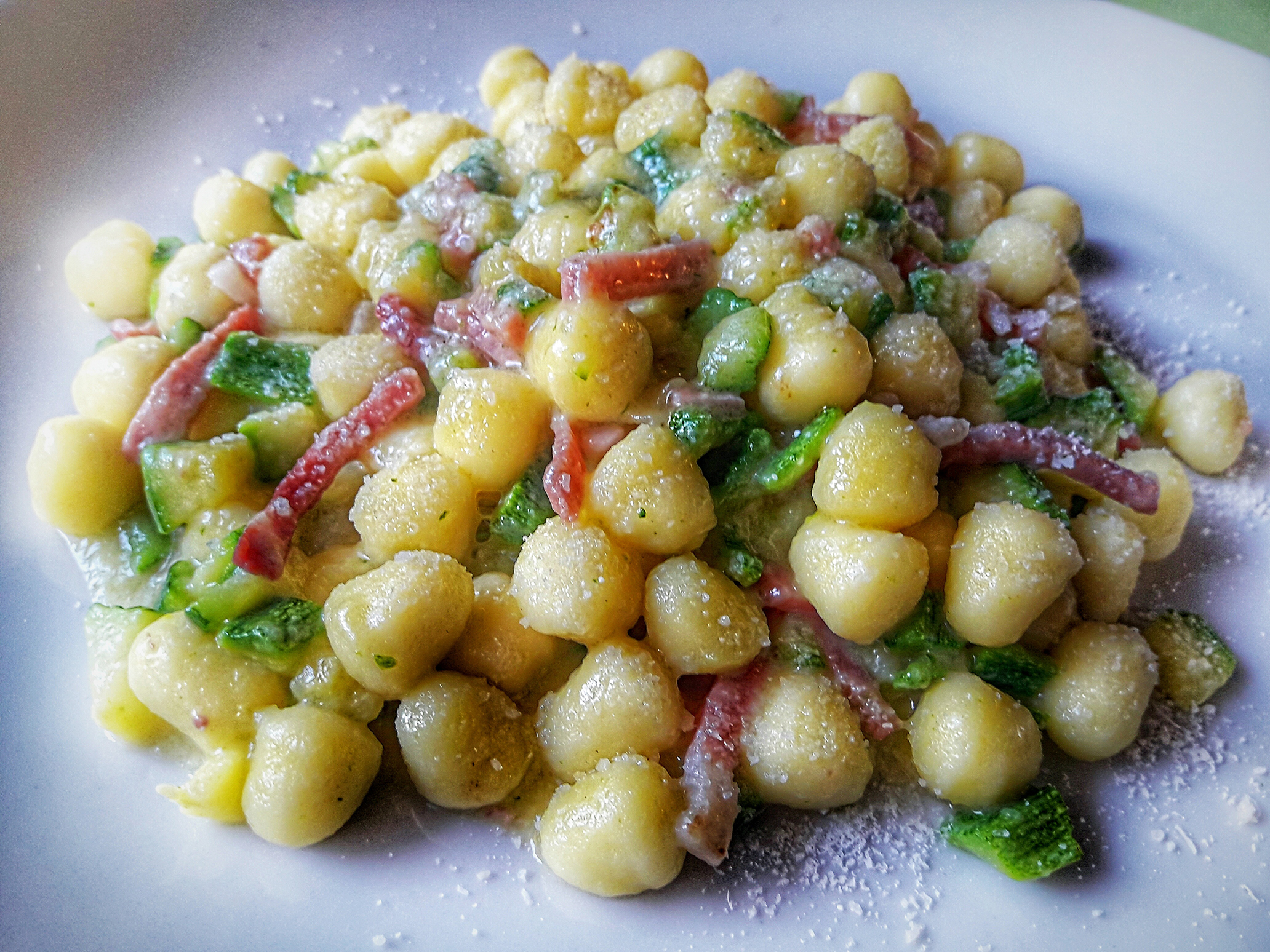 Chicche di patate con crema di zucchine, fiori di zucca, pancetta e parmigiano